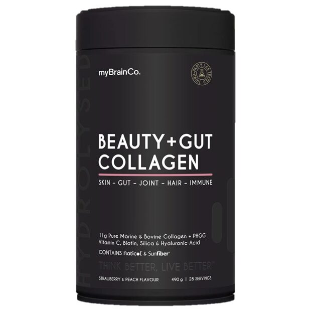MyBrainCo Beauty + Gut Collagen is an advanced inside-out beauty formula created to support skin health, connective tissue, and digestive wellbeing from within. Each serving delivers 11 g of dual collagen peptides from premium marine and grass-fed bovine sources to support skin elasticity, hydration, and structural integrity, while helping maintain healthy skin, joints, and connective tissue as part of a consistent daily routine.