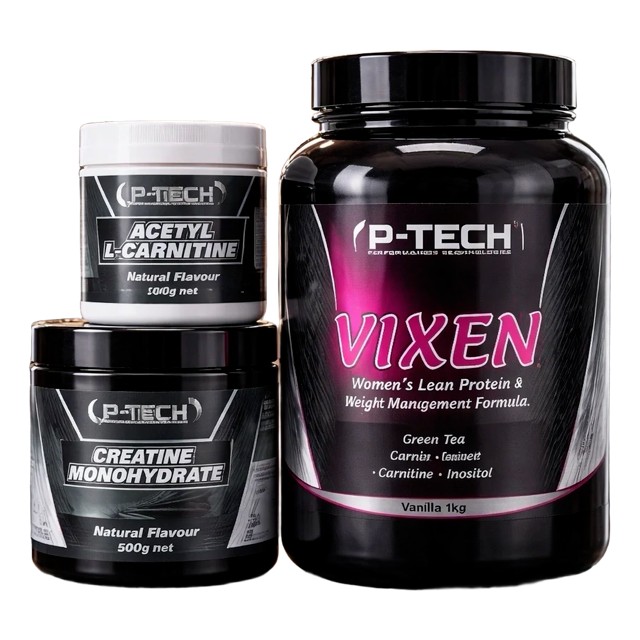 Introducing the P-Tech Women’s Weight Loss & Toning Pack specifically designed for Women’s needs. Pack Includes: P-Tech Vixen 1kg Lean Protein Blend + Added Metabolic Enhancers (Usually $79.95) P-Tech Creatine Monohydrate 500g (Usually $59.95) P-Tech Acetyl-L-Carnitine 100g (Usually $29.95) Usual Pack Price: $169.85 Pack Sale Price: $144.95